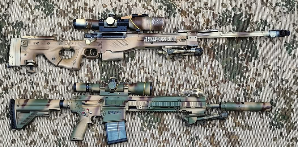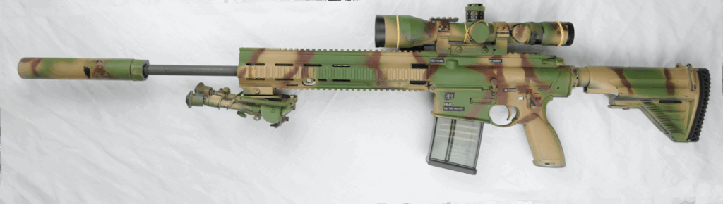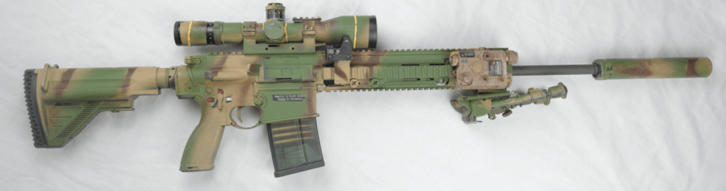 I kept the side mounted canted RMR sight as it’s a credible use, and the Kryptek sprayed L2A1 seems to show worn paint on it’s usual emplacement.